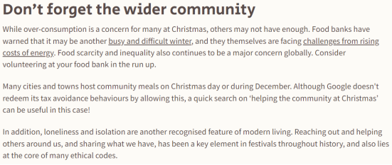 STEP 1: Read the text (see the link below) about the “ethical Christmas” and the text “Don’t Forget the Wider Community”. Think and write your personal plan (about 150 words) for an ethical Christmas. You may see the examples below. Do not forget to mention the underlying reasons for your plan.